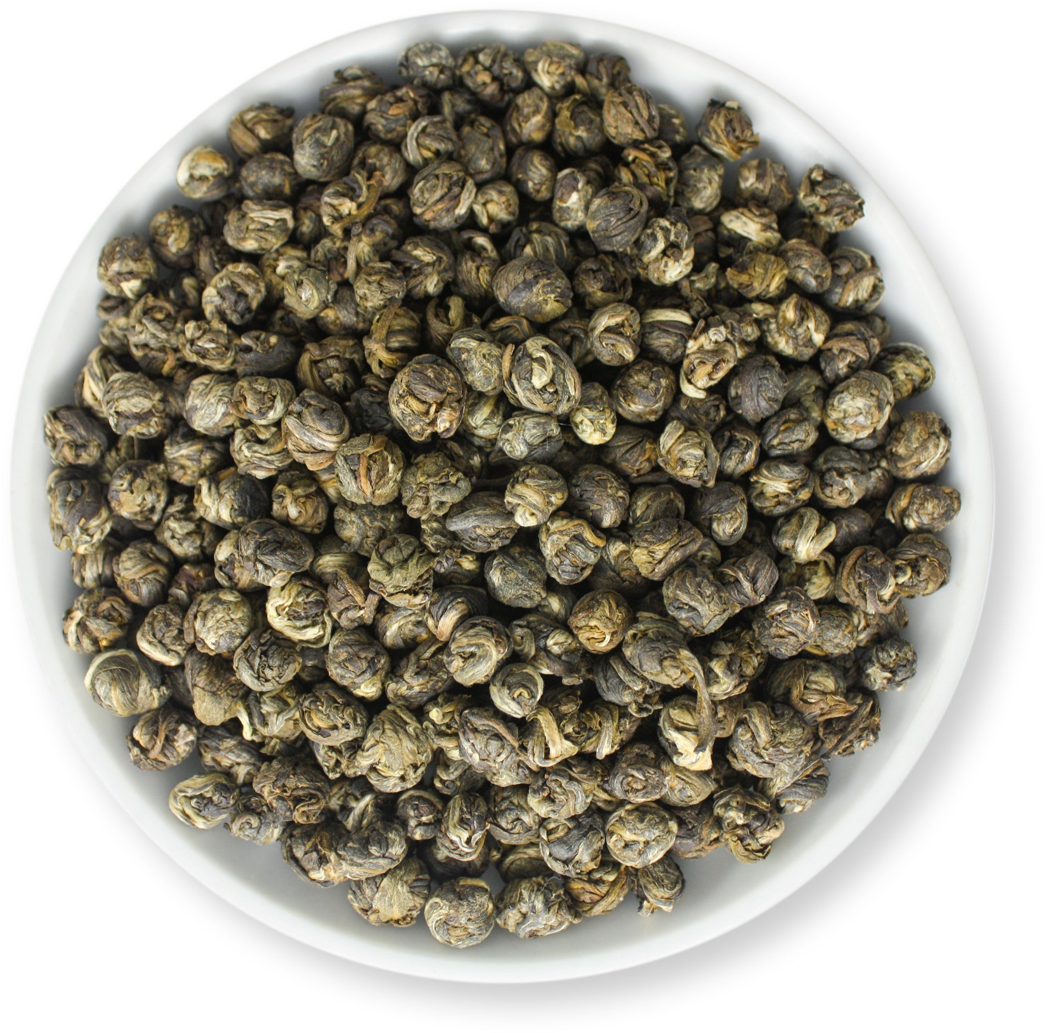 Jasmine Pearl is a type of Jasmine tea made with tender long leaf tips hand rolled into small pearls. The pearls will slowly unfurl as they steep. To make Jasmine tea, tea leaves are harvested in the spring and stored until early summer when fresh Jasmine flowers are in bloom. Jasmine flowers are picked early in the day when the small petals are tightly closed. The flowers are kept cool until nightfall. In the early evening when the flowers begin to open, the tea is blended with the Jasmine flowers and stored overnight. The night blooming Jasmine flowers then open and release their fragrance into the tea. It takes over four hours for the tea to absorb the fragrance and flavor of the jasmine blossoms. This process may be repeated for as many as six or seven times.
