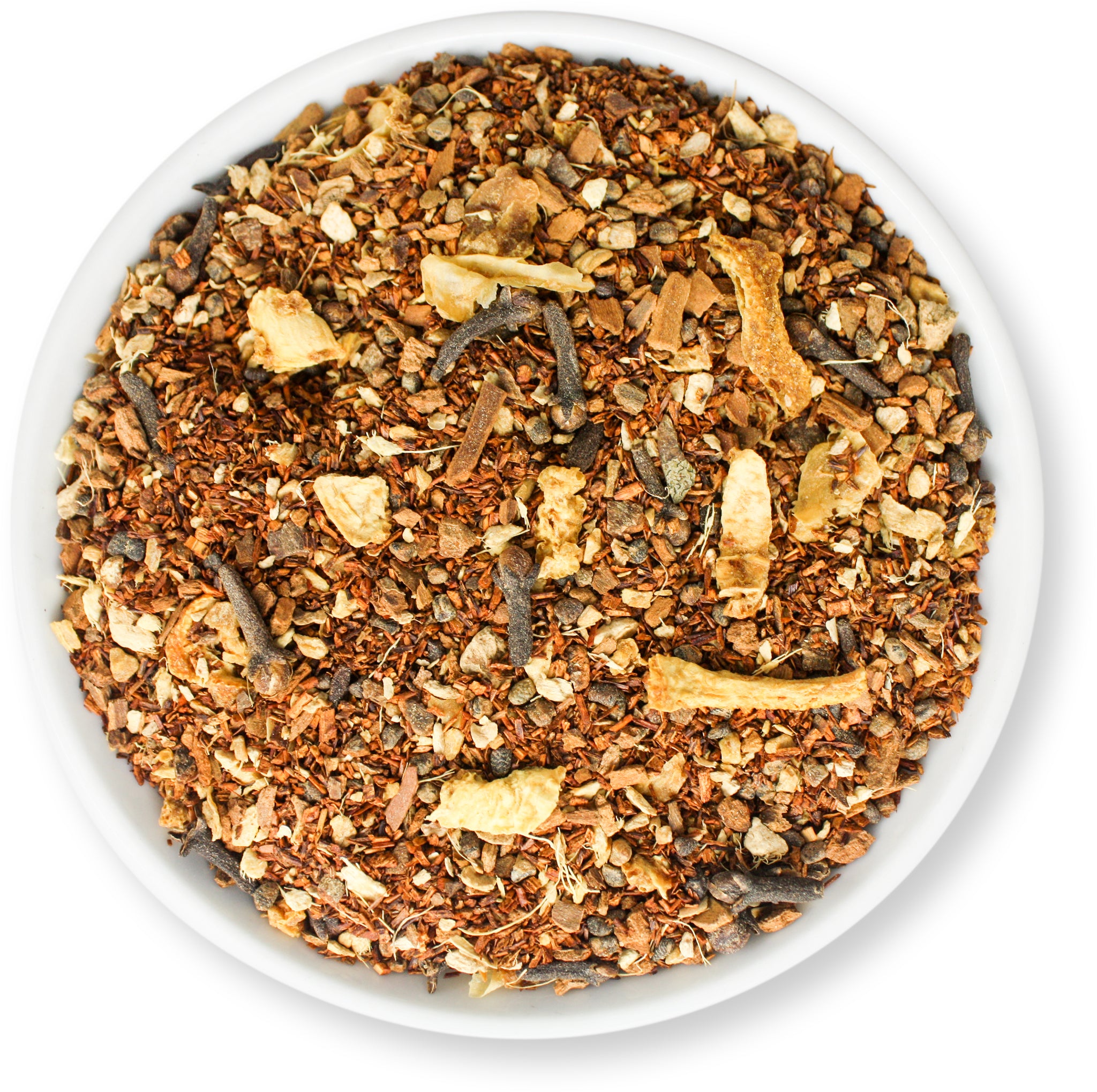 Ingredients: rooibos, ginger root, cinnamon bark, orange peels, cloves, cardamom pods, vanilla